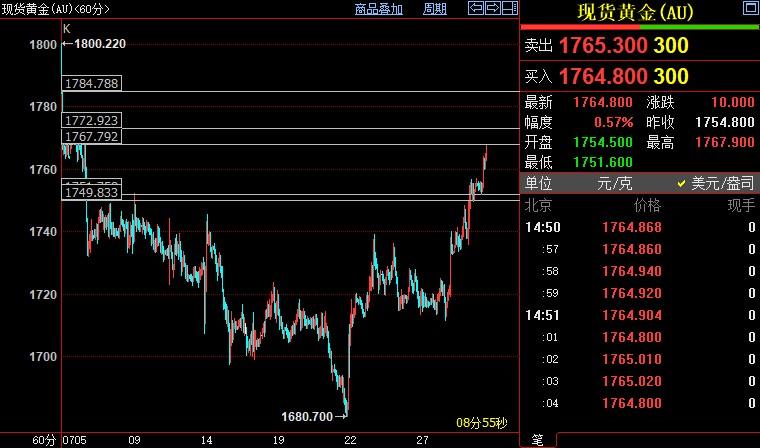 北京时间14:52,现货黄金上涨0.53%至1764.81美元/盎司;COMEX期金主力合约上涨0.70%至1781.6美元/盎司;美元指数下跌0.46%至105.676。