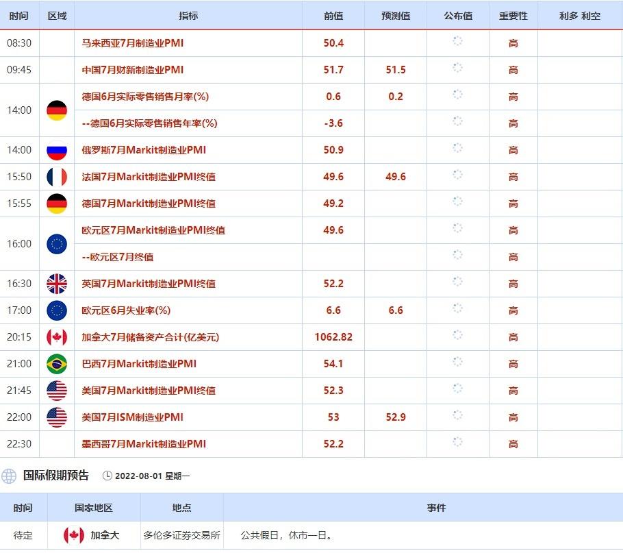 此外,8月1日,加拿大多伦多证券交易所因为公共假日,休市一日。