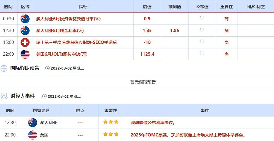 ②8月2日(周二)关键字:澳洲联储利率决议,芝加哥联储主席埃文斯