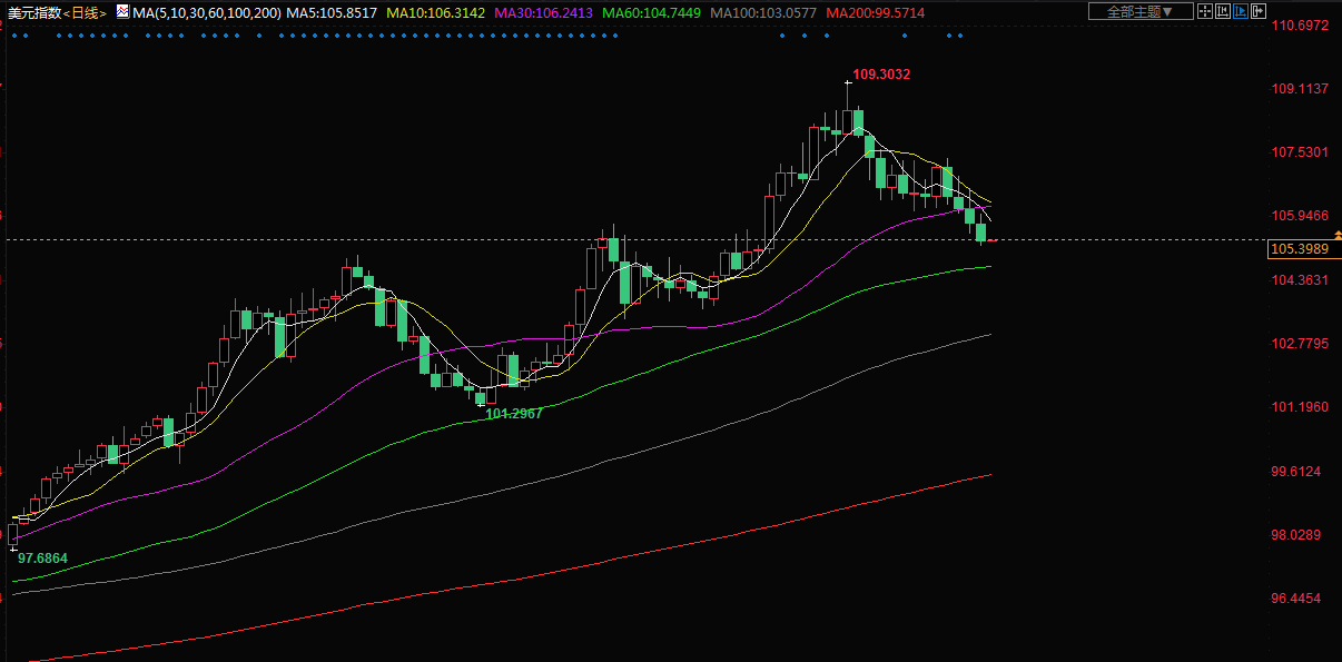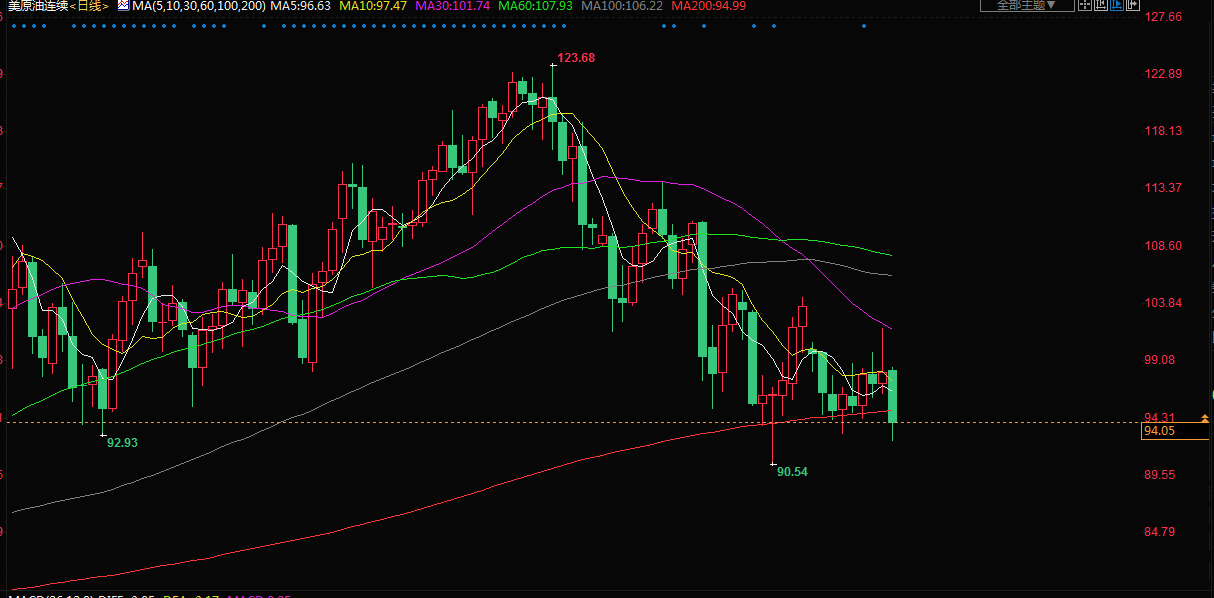 商品收盘方面,布伦特原油期货下跌3.8%,结算价报每桶100.03美元,盘中稍早一度低见99.09美元。美国原油期货下跌4.8%,结算价报每桶93.89美元,稍早低见92.42美元。