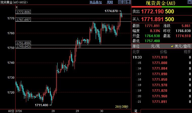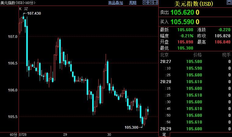 北京时间20:28,现货黄金上涨0.39%至1772.58美元/盎司;COMEX期金主力合约上涨0.44%至1789.6美元/盎司;美元指数下跌0.20%至105.607,盘中创7月5日以来低点105.306。