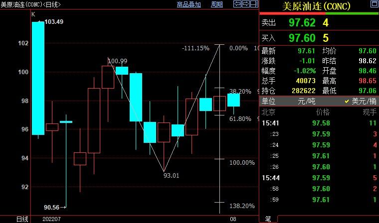 北京时间15:45,NYMEX原油期货下跌1.11%至97.49美元/桶;ICE布伦特原油期货下跌0.51%至103.44美元/桶。