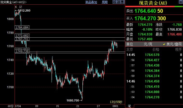 周一(8月1日),国际金价承压,尽管美联储利率路径预期趋缓削弱美元,但美指收益率上升限制了金价快速上涨。不过,金价距离上一交易日创下的7月6日以来高位1767.80美元不远,后市继续看涨,料进一步上摸1785美元。