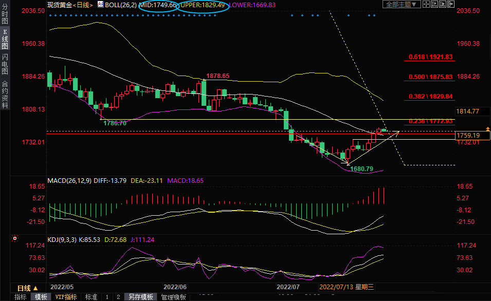 鉴于KDJ的K线和J线也发出了短线超买信号,短线也需提防震荡回调的风险,初步支撑在布林线中轨1749.65附近,若回落至该位置下方,则削弱短线看涨信号;10日均线支撑在1730.66附近,若意外回落至该位置下方,则增加短线看空信号。