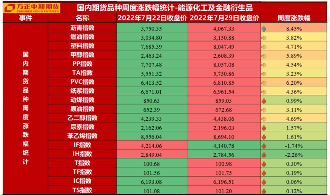金融期货板块:中共中央政治局本周召开,针对疫情防空,会议强调“出现了疫情必须立即严格防控,该管的要坚决管住,决不能松懈厌战。”经济方面,要求“着力稳就业稳物价,保持经济运行在合理区间,力争实现最好结果。”实质上不再严格要求必须达到5.5%增速目标,各省视自身情况而定。财政政策方面“支持地方政府用足用好专项债务限额”,目前地方政府专项债限额和余额尚有1.5万亿元左右的额度可供调用。货币政策要求“加大对企业的信贷支持,用好政策性银行新增信贷和基础设施建设投资基金。”对房地产市场坚持“房住不炒”和“因城施策”,要求“压实地方政府责任,保交楼、稳民生”。海外方面,美国第二季度GDP年化环比萎缩0.9%,为连续第二季度陷入萎缩,美国经济陷入技术性衰退。近期欧美通胀数据再创新高,海外央行政策落地,美联储议息会议连续第二个月加息75BP,鲍威尔讲话略偏鸽派。短期不确定性因素释放后风险资产普遍反弹,美元指数高位回落。国内金融期货与期权市场,股指期货:主要指数走势分化,尤其IF和IH维持震荡走弱,中期多头暂持有,IC和IM相对强势,以横向震荡对待,继续采取高抛低吸短线操作策略。期现套利方面,IC、IM远端反套空间分别在6%和8%附近,资金成本合适可参与,贴水方向仍为收窄。跨品种方面,预计IH/IC和IH/IM比价和价差持续在低位震荡,暂认为中长期趋势为上行,可继续择机做多上述比价。国债期货:目前国内市场收益率礽处于上有顶下有底的状态。操作上,建议交易性资金以震荡思路操作,持仓机构可适当于价格高位进行空头对冲或久期管理。股票与股指期权:波动率后期有望维持震荡的走势,中期以做空波动率策略为主,或短期卖出近月认购期权。商品期权:大宗商品低位反弹,但策略上建议还是以防御性策略为主。短线则可关注日内和日间的Gamma机会。抄底的投资者建议使用期权工具,并严格控制仓位。