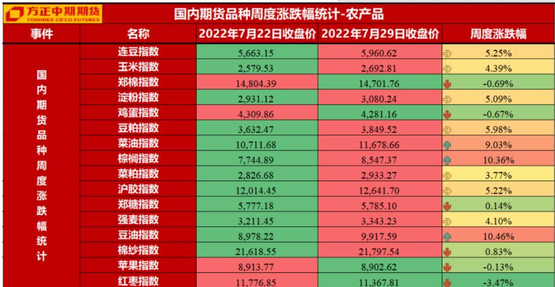 饲料养殖板块:本周饲料养殖产业链走势分化,饲料端走势偏强,而养殖端则表现为滞涨调整。饲料端来看,双粕及玉米本周上涨。宏观层面加息符合预期,风险释放。美豆主产区降雨及气温均不利于作物生长,天气炒作抬头。但只要有一场有效降雨便会使得多头情绪大幅降温,当前并不能得出美豆单边下降的预期,参考去年同期美豆生长情况。因而本次反弹更多的是理解为下跌行情中的中继反弹,不建议追多,考虑反弹做空。玉米同样以反弹做空思路看待。养殖端本周走势偏弱。主动去产能背景下,生猪更多的是在优化产能而非去化,大幅上涨的概率不大,单边建议观望。养殖户可以考虑根据自身利润卖保锁利操作。鸡蛋基本面在7月份可能逐步转为供需双强,蔬菜等生鲜品供给旺季逐步过境,全国逐步入伏,蛋鸡产蛋率环比有望降低,但鸡蛋产量由于存栏上升,难有大幅下降。