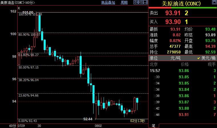 北京时间15:59,NYMEX原油期货上浮0.03%至93.91美元/桶;ICE布伦特原油期货下跌0.33%至99.69美元/桶。