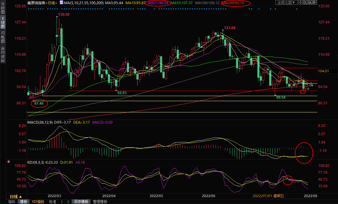 日线级别:震荡下跌;MACD粘合,但红色柱转绿,KDJ死叉运行,短期均线空头排列,高点依次下跌,有点类似“下降三角形”的形态,周二油价反弹后回落,也暗示上方卖压较强,后市略微偏向震荡下行,留意周一低点92.41附近支撑,若跌破该位置,可能会引发破位大跌行情,进一步支撑参考7月14日低点90.54附近位置,然后是2月18日低点87.46附近支撑,中线目标参考1月24日低点81.90附近支撑或者是80整数关口。
