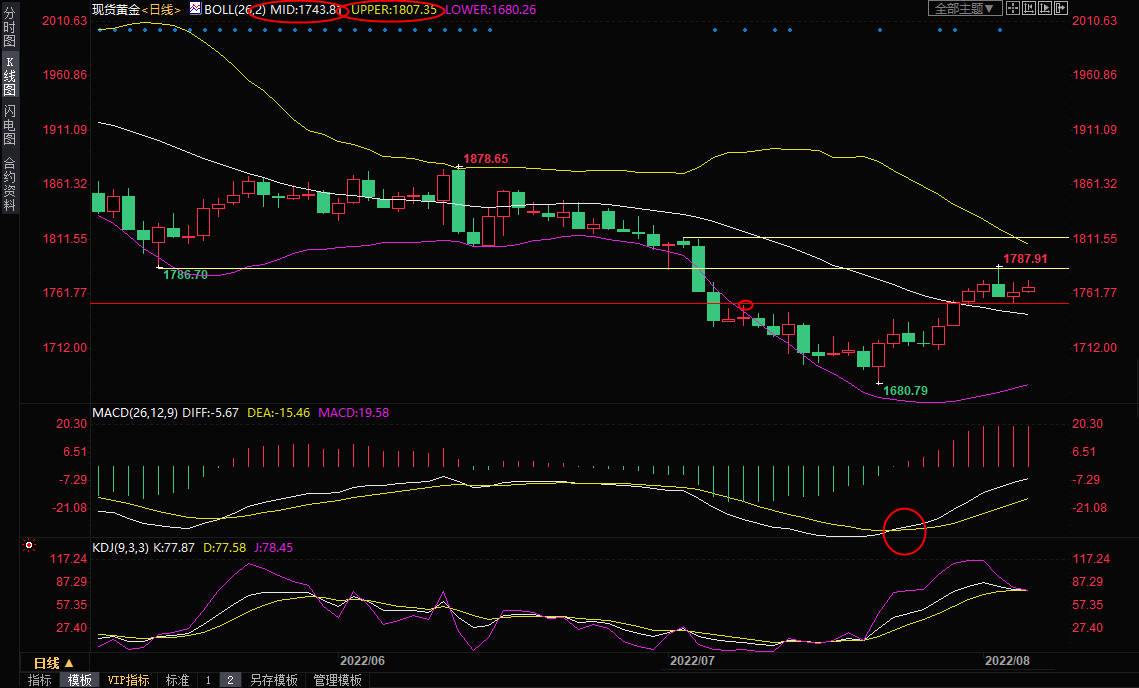 下方初步支撑在7月8日高点1752.36附近,布林线中轨支撑目前在1743.82附近,若回落至该位置下方,则削弱短线看涨信号;21日均线支撑目前在1734.01附近,若意外失守该支撑,则增加后市看空信号。