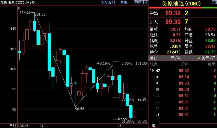 北京时间15:44,NYMEX原油期货上涨0.78%至89.23美元/桶;ICE布伦特原油期货上涨0.67%至94.75美元/桶。两市隔夜分别创2月18日以来新低至87.55美元/桶和2月25日以来新低93.20美元。