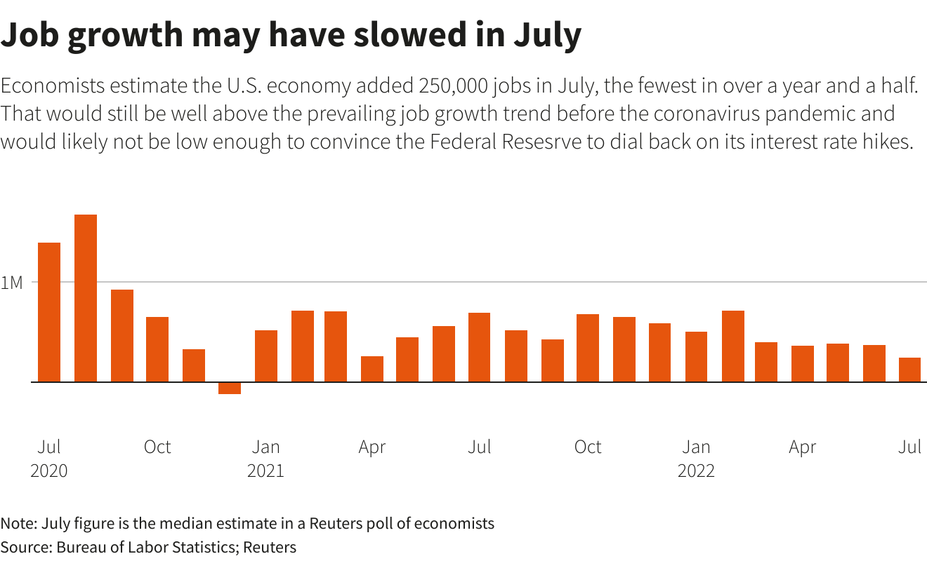 经济分析师预期7月美国仅新增25万个就业岗位,为逾一年半以来最小增幅,但还是远远高于疫情前就业增长的主要趋势,很可能因为不够低,无法说服美联储扭转升息政策。