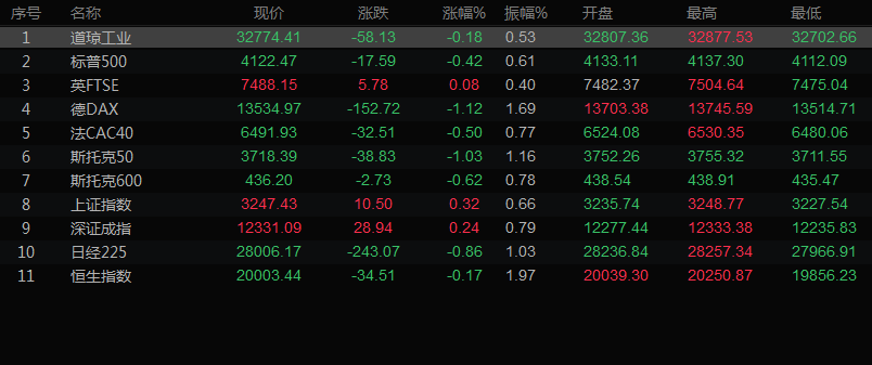 美股收盘情况,道琼斯工业指数下跌0.18%,至32774.41点;标普500指数下跌0.42%,至4122.47点;纳斯达克指数下跌1.19%,至12493.93点。