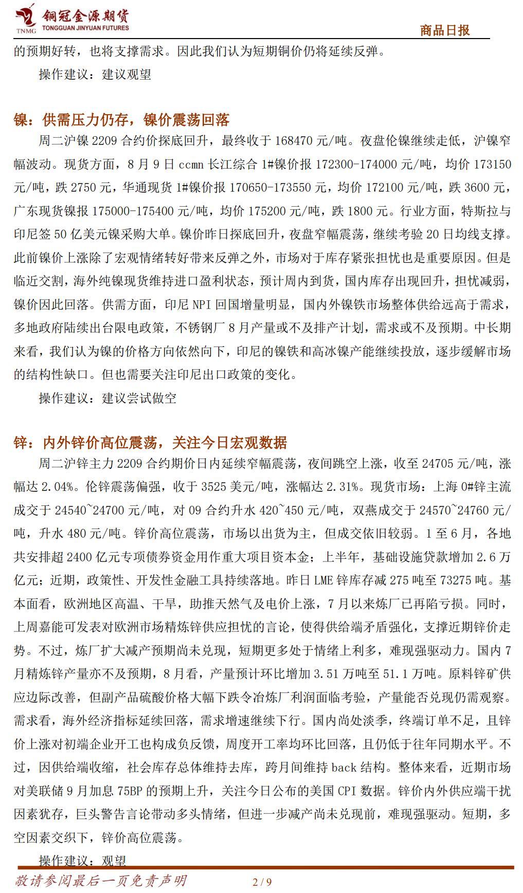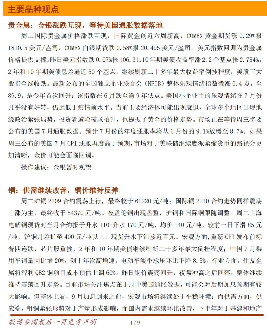 铜:供需继续改善,铜价维持反弹。周二沪铜 2209 合约震荡上行,最终收于 61220 元/吨;国际铜 2210 合约走势同样震荡上涨为主,最终收于 54370 元/吨。夜盘伦铜出现盘整,沪铜和国际铜跟随调整。周二上海电解铜现货对当月合约报于升水 110-升水 170 元/吨,均价 140 元/吨,较前一日下滑 85 元/吨,沪铜月差扩至 400 元/吨以上,现货升水下泄接近百元。宏观方面,重磅 CPI 发布前标普四连跌,芯片股重挫,2 年和 10 年期美债继续刷新二十多年最大倒挂程度;中国 7 月乘用车销量同比增 20%,创十年次高增速,电动车淡季承压环比下降 8.5%。行业方面,住友金属将智利 QB2 铜项目成本预估上调 60%。昨日铜价震荡回升,夜盘冲高之后回落,整体继续维持震荡回升走势。目前市场关注焦点在于周中美国通胀数据,可能会对后期加息预期有较大影响。但整体上看,9 月加息到来之前,宏观市场将继续处于平稳环境;而供需方面,供应端,粗铜紧张形势对于产量形成影响,而国内需求继续环比改善,下半年对于基建和地产的预期好转,也将支撑需求。因此我们认为短期铜价仍将延续反弹。