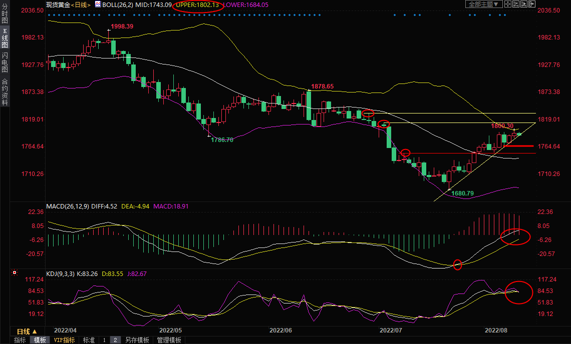 技术面来看,在失守10日均线1775前,短线仍略微偏向多头,但也需要留意布林线上轨1802附近阻力的压制情况。