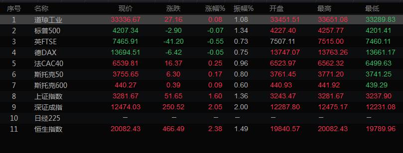 美股收盘情况,道琼斯工业指数上涨0.08%,至33336.67点;标普500指数下滑0.07%,至4207.27点;纳斯达克指数下跌0.58%,至12779.91。