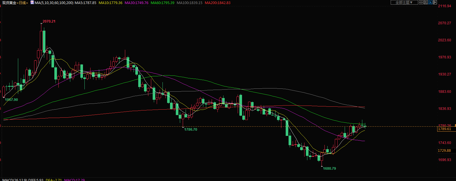 金价周四下跌,受累于美联储将进一步加息的前景,尽管数据显示美国通胀有触顶的迹象。High Ridge Futures金属交易主管David Meger表示,黄金一直在1800美元的关键水平附近徘徊,市场已经调低了加息预期,这也削弱了美元。尽管大多数美联储的发言继续暗示会进行更多加息,金市已经消化了大部分的加息预期,是未来预期的差异在推动交易。