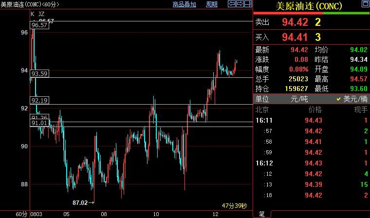 北京时间16:16,NYMEX原油期货下沉0.02%至94.32美元/桶;ICE布伦特原油期货上涨0.25%至99.82美元/桶。
