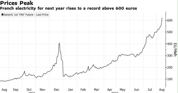 下图显示法国明年电价升至创记录的600欧元/兆瓦时以上