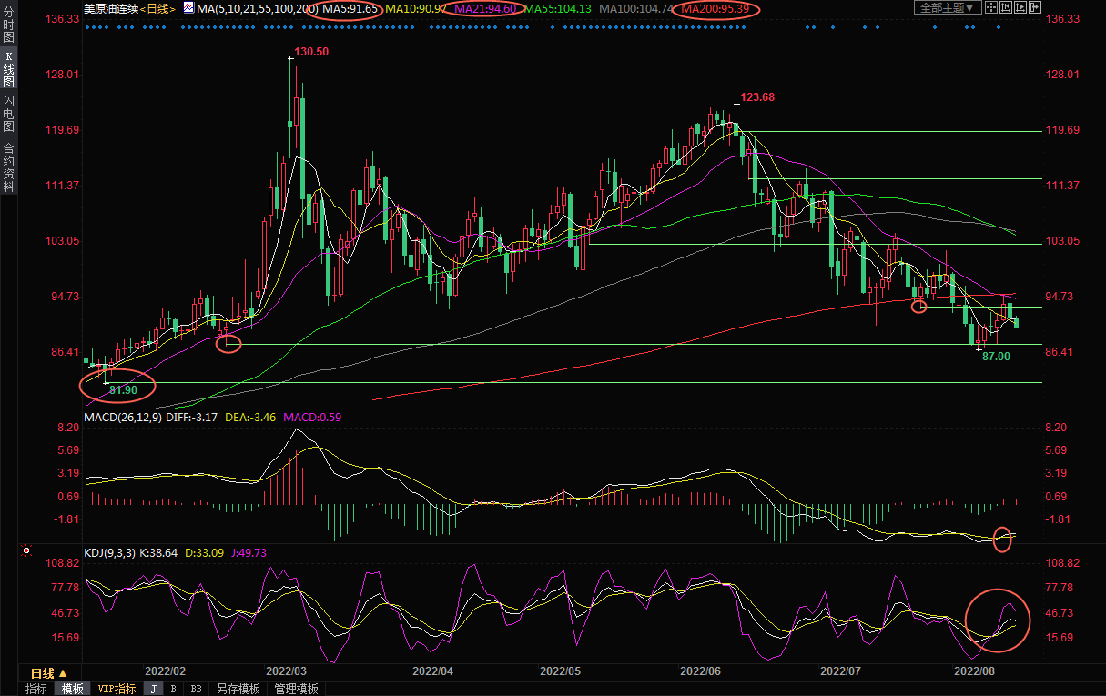 不过,在跌破87.46前,油价仍留有低位震荡筑底的可能,上方关注200日均线95.39附近阻力,若能顶破该阻力,则增加后市看涨信号;短线的话,5日均线阻力目前在91.65附近7月25日低点93.01为也可以简单予以留意。