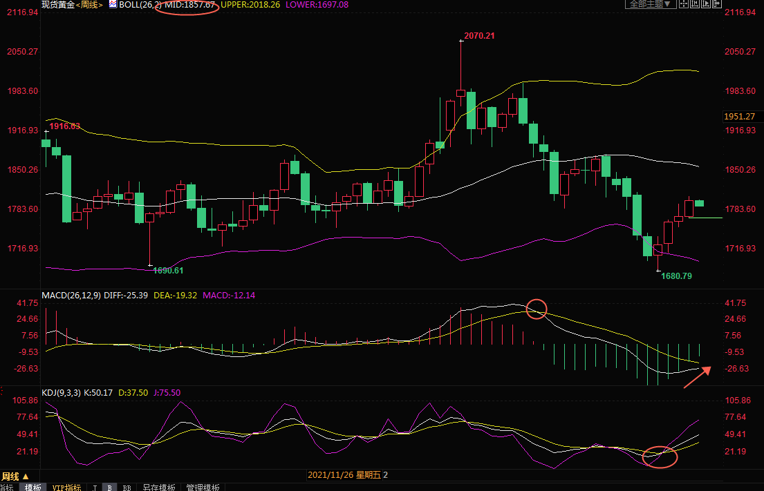 周线级别:震荡下跌后反弹;KDJ金叉, 金价自布林线下轨附近反弹,后市偏向进一步试探布林线中轨1857.69附近阻力。