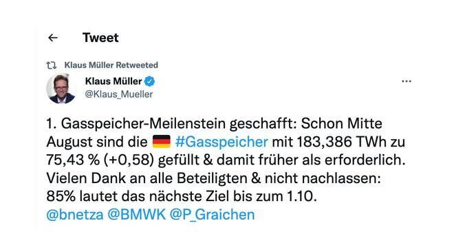 “第一阶段目标已经实现”,德国能源监管机构联邦网络局(Federal Network Agency)局长克劳斯·穆勒(Klaus Mueller)发推表示,“储气设施填充水平已达75.43%,下一个目标是到10月1日达到85%。”