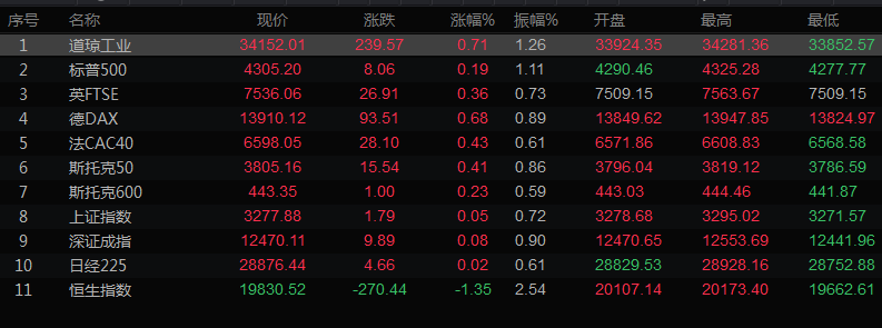 美股收盘情况,道琼斯工业平均指数上涨0.71,收于34152.01点;标准普尔500指数上涨0.19%,收于4305.20点;纳斯达克综合指数下跌0.19%,收于13102.55点。