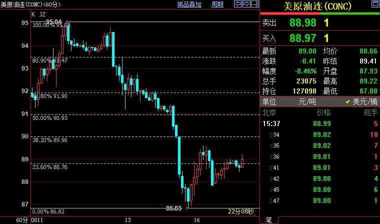 北京时间15:39,NYMEX原油期货下跌0.50%至88.96美元/桶;ICE布伦特原油期货下跌0.77%至94.38美元/桶。两市隔夜大跌逾4%,美油创2月初以来新低至86.82美元/桶。