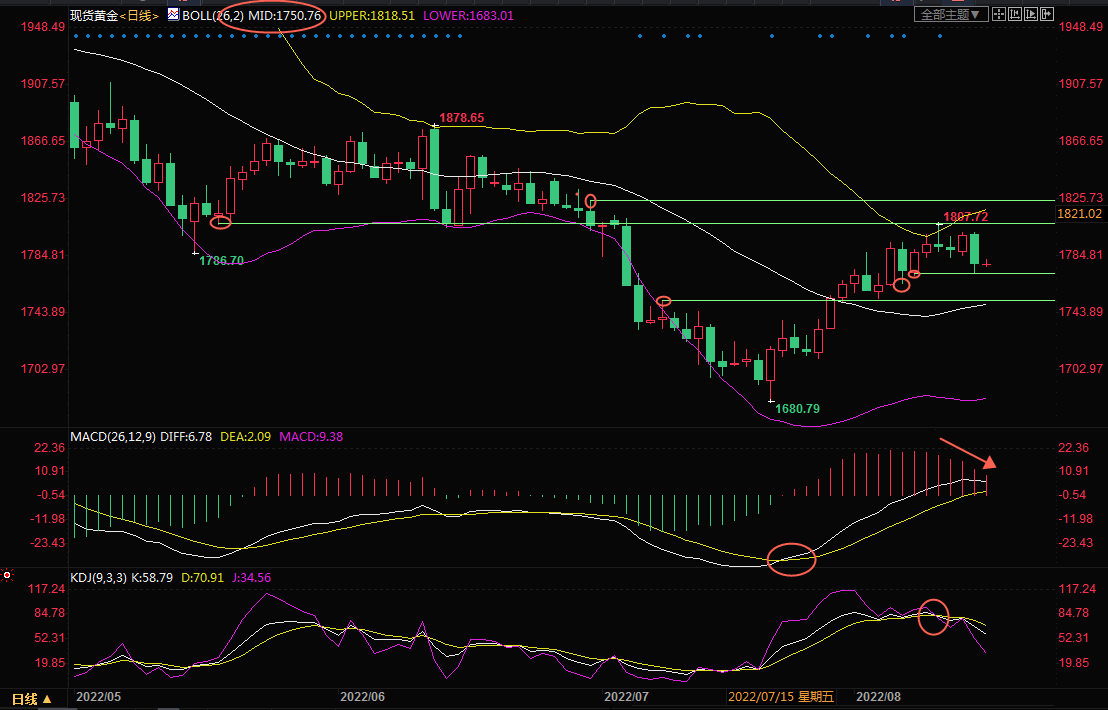 日线级别:震荡上涨;金价在1800关口和布林线上轨等多重阻力附近受阻后回落,KDJ死叉运行,MACD红色柱萎缩,K线在强阻力位和相对高位出现“看跌吞没”,增加了短线见顶风险,初步支撑在8月8日低点1770.58附近,7月8日高点和布林线中轨支撑在1750.79附近,若下破该支撑,则增加中线看空信号。