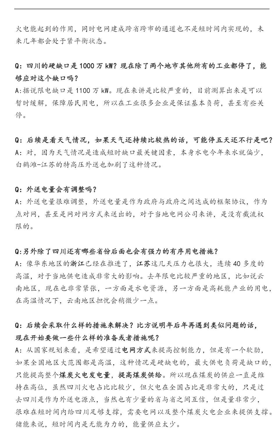 Q:四川限电情况和国网南网区域内限电情况? A:四川重庆限电比较严重,有些地方甚至下达了红头文件进行限电,对一些企业的运营影响很大,有些企业可能都停工了,首先看一下天气原因,今年很多地方遇到了几十年难遇的高温极端天气,这样天气带来的影响,不是光伏发电发的多了,有时候温度越高,光伏发电反而越少,直接影响的是居民用电量极大的增加。