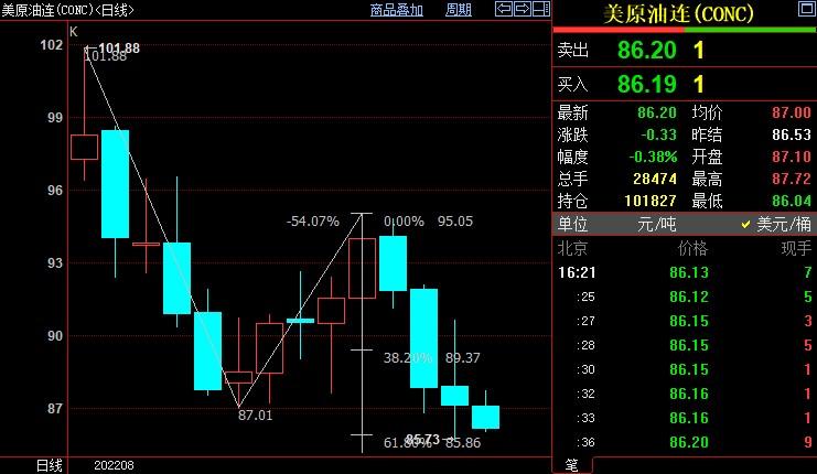 北京时间16:22,NYMEX原油期货下跌0.46%至86.13美元/桶;ICE布伦特原油期货下跌0.65%至91.72美元/桶。
