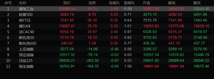 美股收盘情况,道琼斯工业指数上涨0.06%,至33999.04点;标普500指数上涨0.23%,至4283.74点;纳斯达克指数上涨0.21%,至12965.34点。