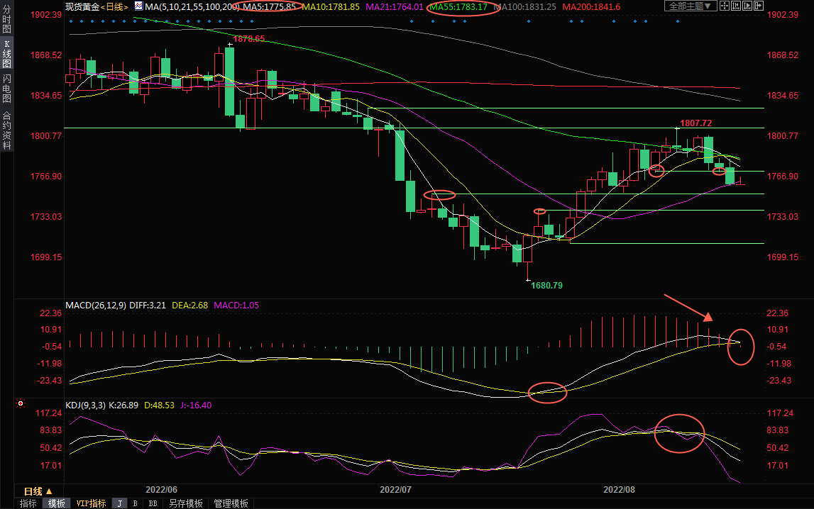 如果金价坚守1752.36附近支撑,则多头仍有机会重拾涨势;上方初步阻力在 8月8日低点1770.58附近,5日均线阻力在1775.89附近,10日均线和55日均线阻力在1783.17附近,若能强势收复该位置,则增加短线看涨信号。