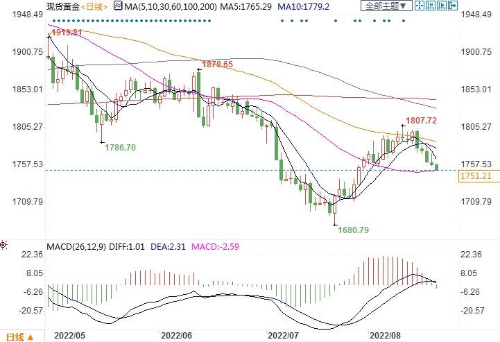 本周现货黄金在连续四周上涨之后首次下跌,目前累计跌幅约2.8%,回吐过去逾两周涨势,盘中创7月28日以来新低至1749.71美元/盎司。本周美元指数大涨约2.1%,刷新7月18日以来高位至107.994。因市场评估美联储7月会议纪要,认为高通胀持续时间或远超预期,美联储或在9月会议上继续激进加息,进而施压黄金价格。