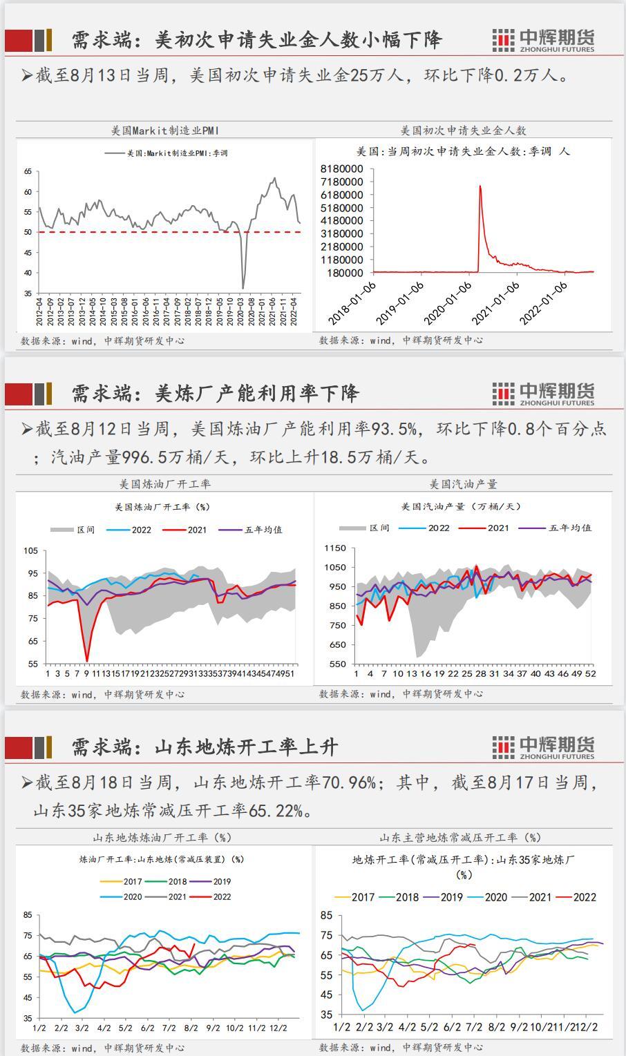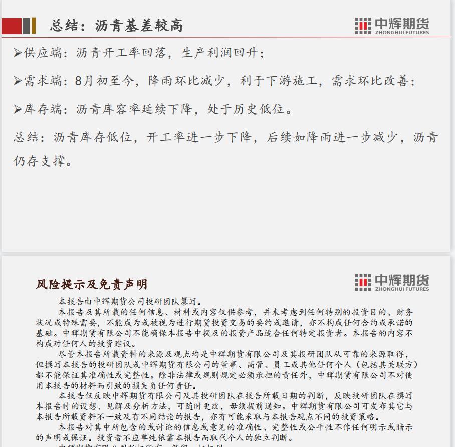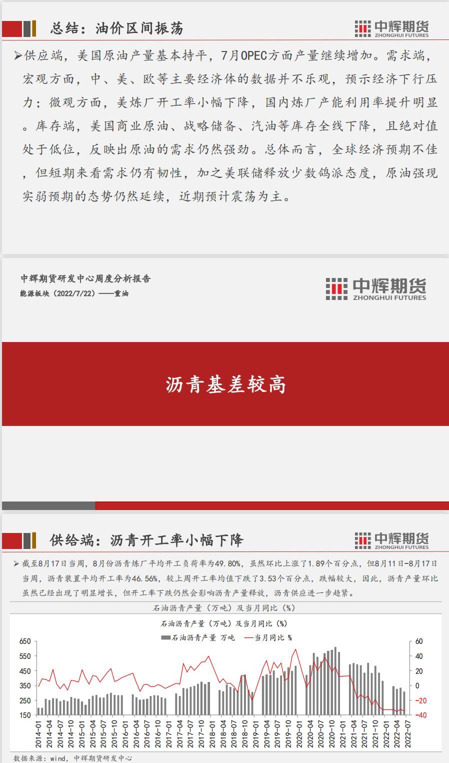 供应端,美国原油产量基本持平,7月OPEC方面产量继续增加。需求端,宏观方面,中、美、欧等主要经济体的数据并不乐观,预示经济下行压力;微观方面,美炼厂开工率小幅下降,国内炼厂产能利用率提升明显。库存端,美国商业原油、战略储备、汽油等库存全线下降,且绝对值处于低位,反映出原油的需求仍然强劲。总体而言,全球经济预期不佳,但短期来看需求仍有韧性,加之美联储释放少数鸽派态度,原油强现实弱预期的态势仍然延续,近期预计震荡为主。