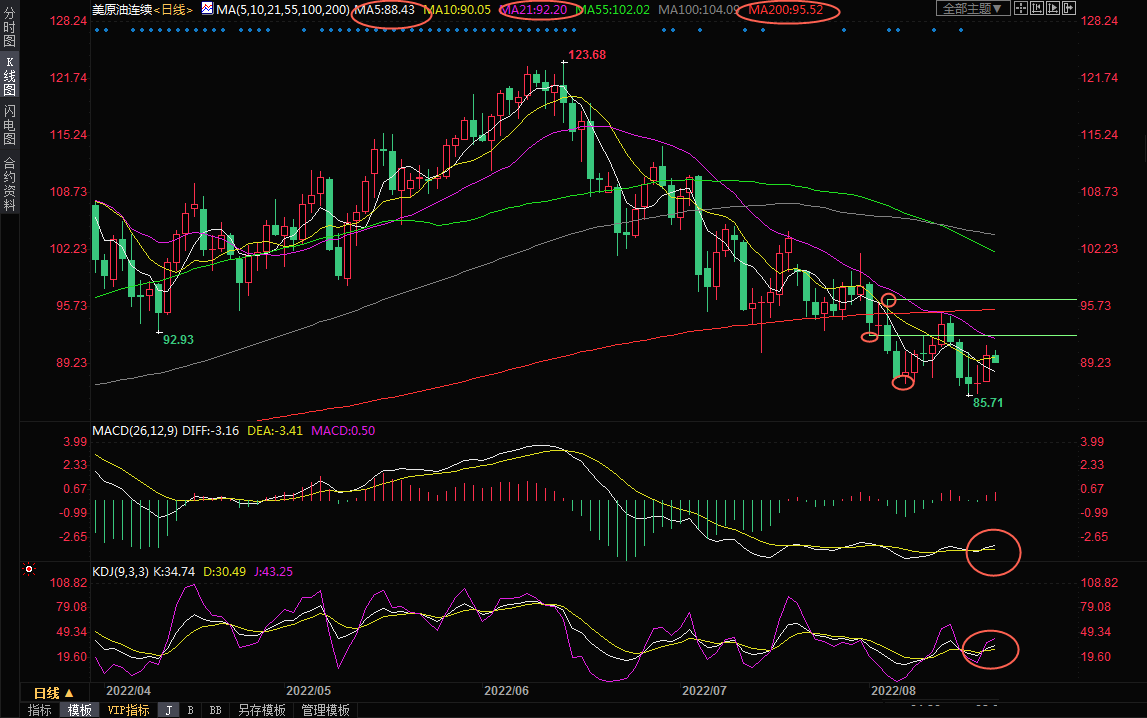 鉴于MACD和KDJ的金叉信号还比较弱,此前55日均线也下穿了100日均线形成死叉,油价后市仍有震荡回落的风险,初步支撑在5日均线88.44附近,8月5日低点支撑在87.00关口附近,若失守该支撑,则增加短线看空信号。近期低点支撑在85.71附近,强支撑在1月24日低点81.90附近。