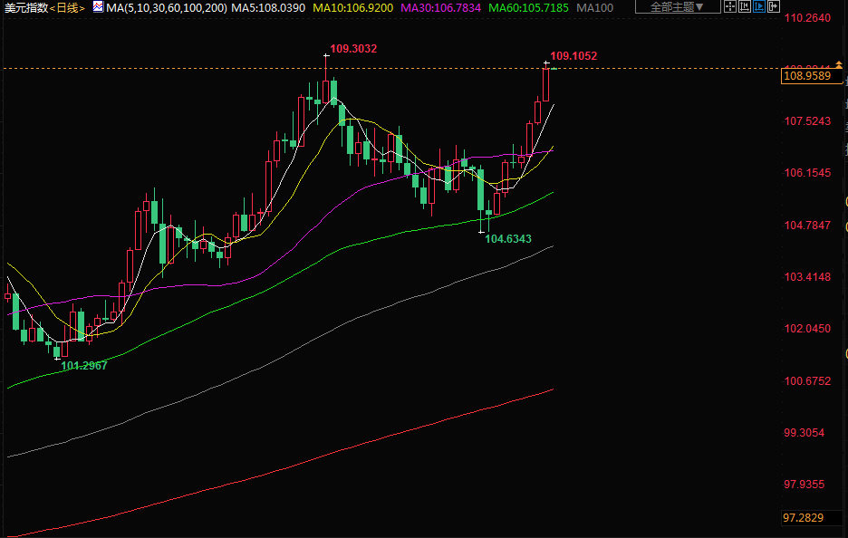 美元周一全线上涨,兑欧元再次升穿平价,投资者愈发担心美国和欧洲加息以遏制通胀的行动会削弱全球经济,因此远离风险较大资产。美元兑一篮子货币上涨0.8%,触及逾五周高位109.02 ,距离7月中触及的20年高位109.29不远。