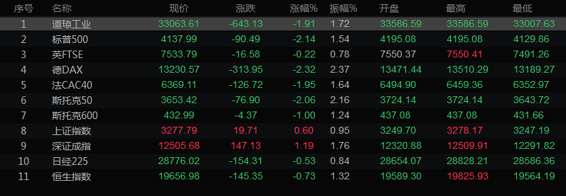 美股收盘情况,标普500指数急挫2.14%,收报4137.99点。纳斯达克指数重挫2.55%,收报12381.57点。道琼斯工业指数下跌1.91%,收报33063.61点。