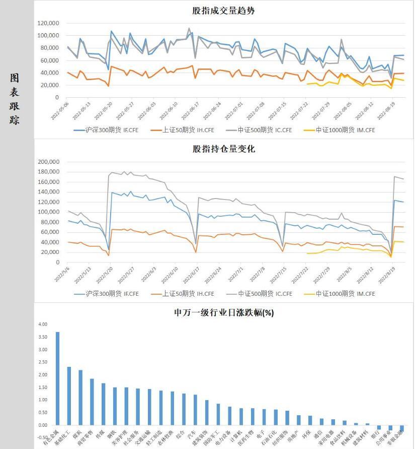 2、今日三大指数集体低开高走,受到LPR非对称调降的利好消息提振,市场信心边际回升,三大指数震荡拉升,新能源汽车免征车辆购置税的政策延至明年底,带动锂矿和新能源汽车板块上涨,创业板指涨超1.5%。北向资金全天保持净流入状态,尾盘净流入速度有所放缓,两市成交额连续5个交易日维持万亿以上。上周五三大指数集体单边下行,创业板指和深证成指均跌超1%,受到光伏上游龙头企业布局下游组件的市场消息催化,光伏版块带动赛道股集体回撤,同时资金也有高低切换的需求。欧美经济数据好坏参半,欧美央行集体释放鹰派信号,外资表现谨慎,但当前国内外市场宏观环境表现较弱,存量资金博弈是当前市场的主要运行逻辑。上周五美股集体下挫,纳斯达克指数跌超2%。美联储官员,圣路易斯联储主席布拉德和堪萨斯城联储主席乔治在内,多名美联储官员周四都重申,需要继续加息打压高通胀,承认这其中会存在导致经济衰退的风险,但让通胀回落至2%是最高目标。同时欧元区7月CPI创下新高,上周五德国公布的7月PPI同比增速也创出新高,能源价格的大幅波动,高通胀压力下,欧洲央行多位官员讲话支持继续加息。欧美股市受激进加息和衰退预期的打击,高成长型科技股跌幅扩大,主要股指全周累跌,未能延续上周涨势,其中能源和公用事业累涨。欧美国债收益率大幅上涨,10年期国债收益率日内升幅超10个基点,刷新7月下旬以来的高位。美元指数也应声上涨,7月中旬以来首次盘中突破108。接下来投资者关注即将在周五召开的杰克逊霍尔(Jackson Hole)全球央行年会,美联储主席鲍威尔将在这次年会上发表讲话,讨论经济前景,并为未来美联储加息路径提供蛛丝马迹。继上周MLF缩量续作后,LPR非对称调降落地,整体符合市场预期,凸显出当前宏观经济基本面的复苏需要政策的支持,流动性宽松仍是短期内权益市场的交易逻辑。但是也需注意到当前赛道股存在内部高切低的需求,交易拥挤度上升将使市场波动放大,IC与IM进一步上行的空间有限。而宏观经济环境疲软使IF与IH维持偏弱震荡的格局。申万一级31个行业中28个行业上涨,其中有色金属,基础化工和煤炭行业领涨,非银金融行业领跌。