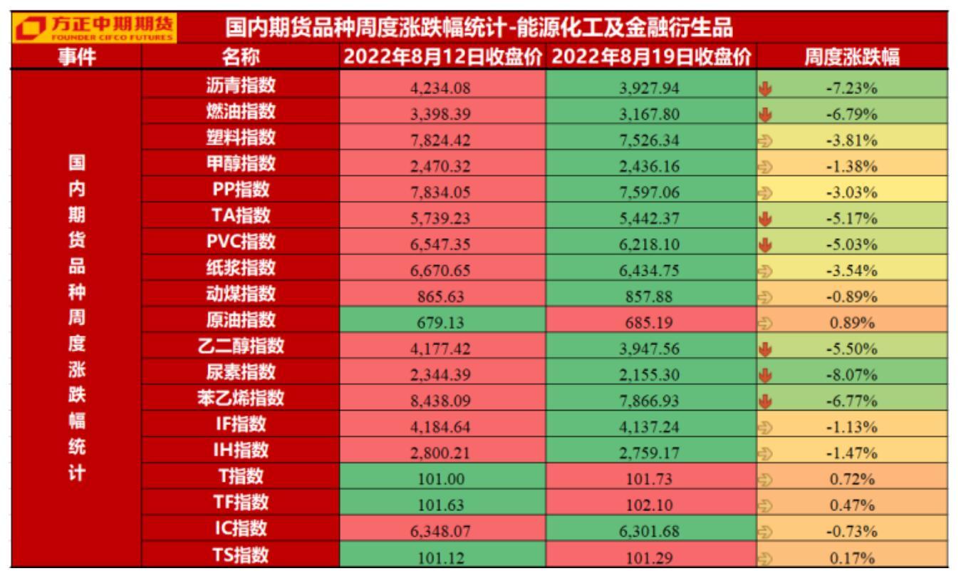 石油化工板块:本周,尽管国际原油价格下行,SC原油受仓单注销和人民币贬值等因素影响,价格表现偏强;燃料类品种受自身供需关系影响,走势坚挺;下游化工品由于高温限电进一步抑制了需求恢复,叠加国际原油价格下行,导致化工品价格跌势明显。展望后市,SC原油短线预计维持高位震荡,但是国际原油走势仍然偏弱,总体趋势将维持震荡下行;燃料油方面,高硫燃油受高库存和产量提升影响,价格将受压制,低硫燃油受国内成品油带动表现偏强;苯乙烯计划外检修增加,且下旬需求预计环比好转,价格存止跌反弹预期;聚酯产业链方面,终端需求未见明显改善再叠加高温限电,对上游聚酯负反馈明显,另外PTA和乙二醇等部分检修装置重启,供应增加,使得聚酯产业链基本面仍然偏弱,价格将维持偏弱震荡。