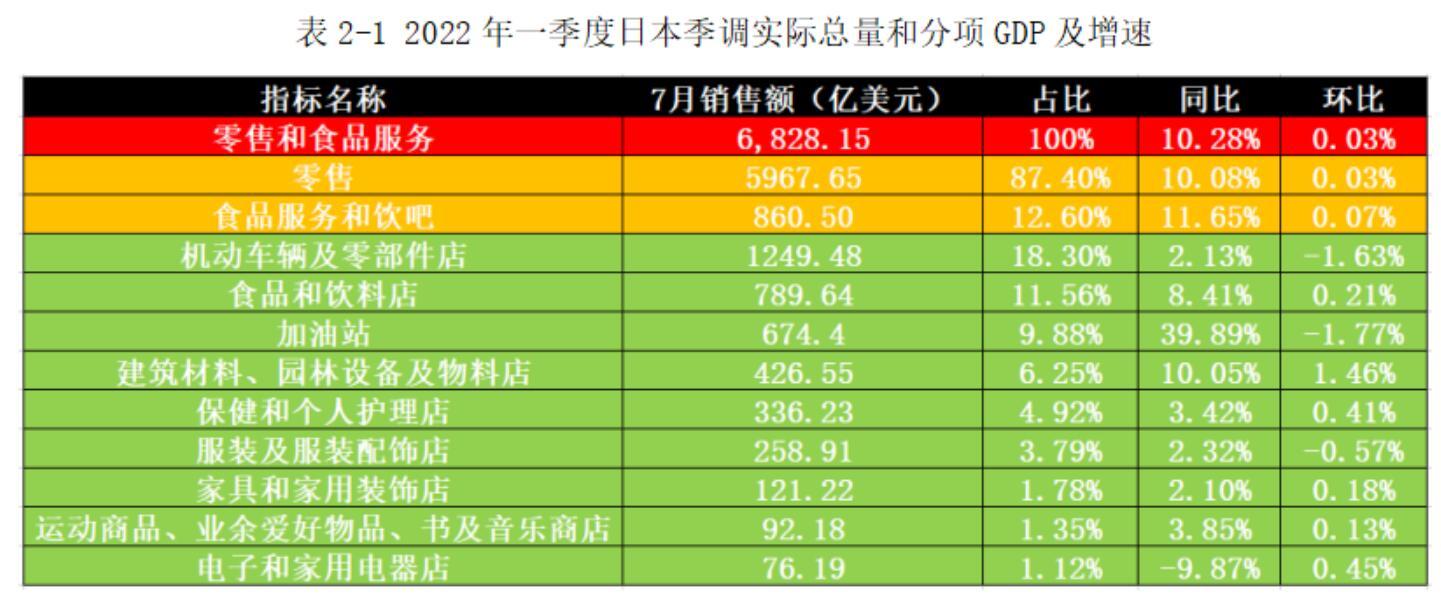 从两大分项来看,零售板块录得5967.65亿美元,占比达到87.4%;食品饮料和服务板块消费录得860.5亿美元,占比为12.6%。相较而言,“食品饮料和服务”消费的边际增速快于“零售”消费。前者7月的同比和环比增速分别录得10.08%和0.03%,后者分别录得11.65%和0.07%。