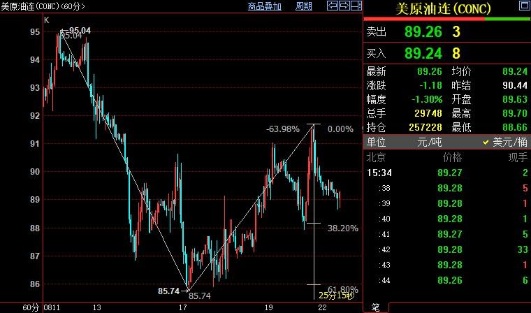 北京时间15:36,NYMEX原油期货下跌1.32%至89.25美元/桶;ICE布伦特原油期货下跌1.20%至95.45美元/桶。