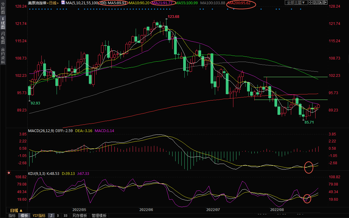 在顶破200日均线前,油价仍处于低位震荡走势,目前下方5日均线支撑在89.93附近,失守该位置前,短线偏向多头,如果回落至该位置下方,则需要提防油价转跌的风险;上周五低点88.34附近支撑可以简单留意一下,8月5日低点支撑在87.00关口附近,强支撑在近期低点85.71附近。