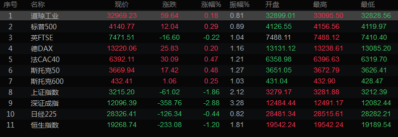 美股收盘情况,标普500指数收高0.29%,报4140.77点;纳斯达克指数上涨0.41%,至12431.53点,道琼斯工业指数上涨0.18%,至32969.23点。
