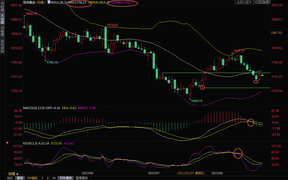 日线级别:震荡下跌;MACD死叉,KDJ死叉,5日均线下穿10日均线,10日均线下穿21日均线,金价处于布林线中轨下方,短线空头仍处于上风,后市下行风险仍存,偏向进一步跌向布林线下轨,目前该支撑在1702.28附近;短线的话,本周低点1727.69附近还存在一些支撑,若失守该支撑,则增加短线看空信号,进一步支撑在7月27日低点1711.38附近。