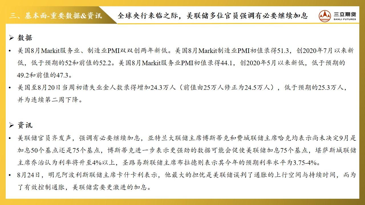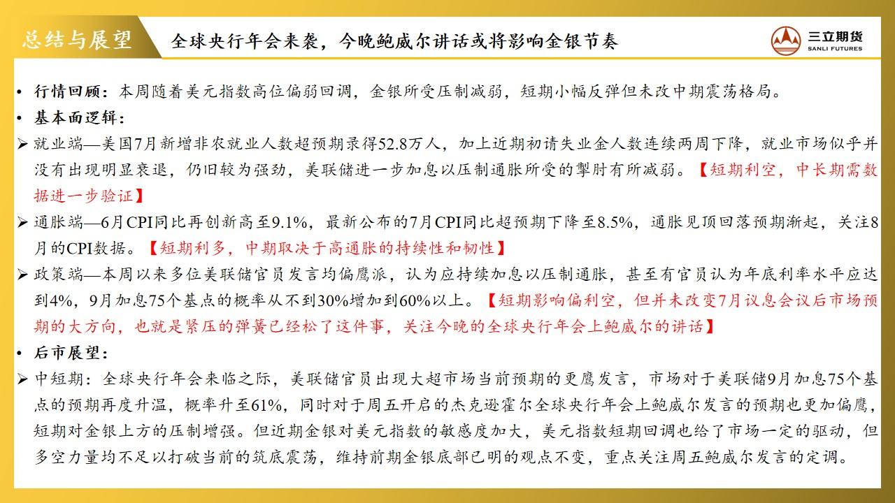 三立期货贵金属周报:全球央行年会来袭,鲍威尔讲话影响金银节奏 2022-08-26 18:04 全球央行年会来袭,鲍威尔讲话影响金银节奏。三立期货公司授权文本由“专注期货开户交易及专业行情分析资讯网站”:【一期货 www.1qh.cn】转发