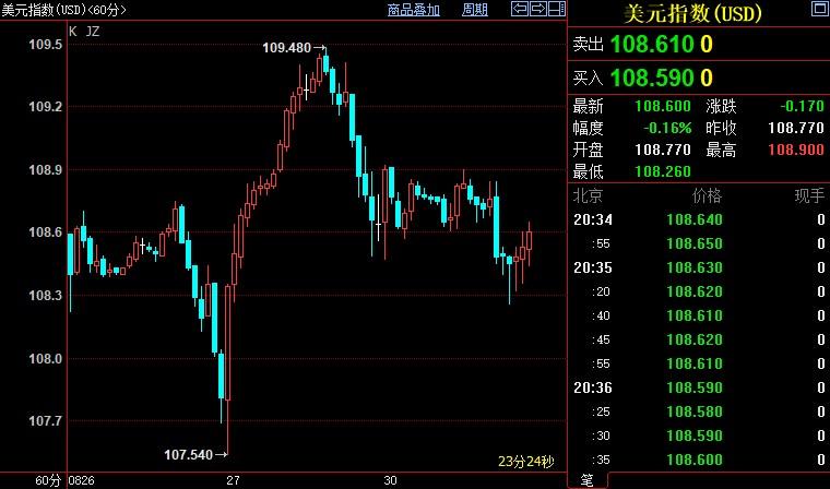 北京时间20:35,现货黄金下跌0.30%至1731.76美元/盎司;COMEX期金主力合约下跌0.34%至1743.7美元/盎司;美元指数下跌0.17%至108.594。