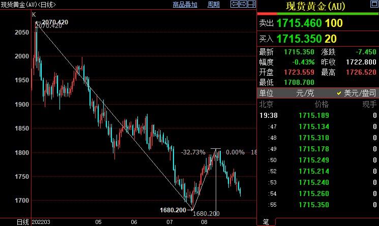 周三(8月31日),现货黄金创7月21日以来新低至1709.58美元/盎司,将连续第五个月收跌,本月下跌逾2.8%,因好于预期的美国经济数据和美联储官员的强硬表态暗示,利率将进一步上升,尽管围绕美联储9月份加息幅度的争论仍在继续。