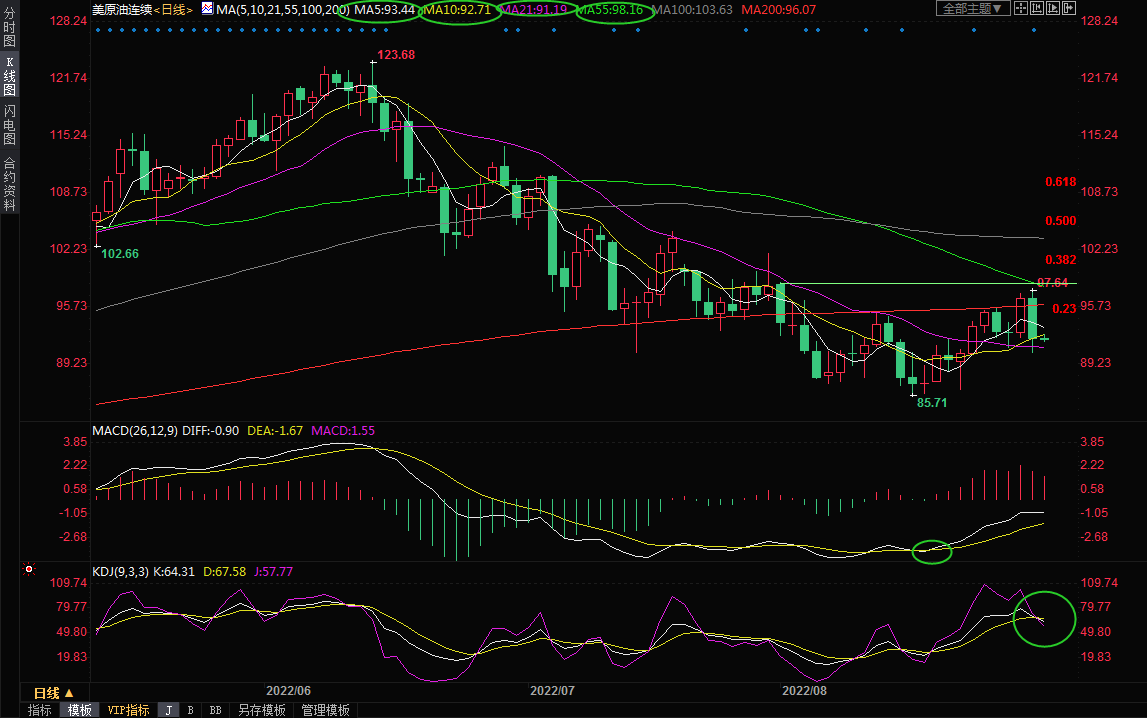 日线级别:震荡;油价受到55日均线阻力后不仅重新回落至200日均线下方,更是连续失守5日均线和10日均线,KDJ更是重新结成死叉,油价短线下行风险显著增加,初步支撑在21日均线91.18附近,然后是90关口附近支撑,如果失守该支撑,则油价可能会重新试探8月份低点85.71附近支撑,布林线下轨支撑也在该位置附近。