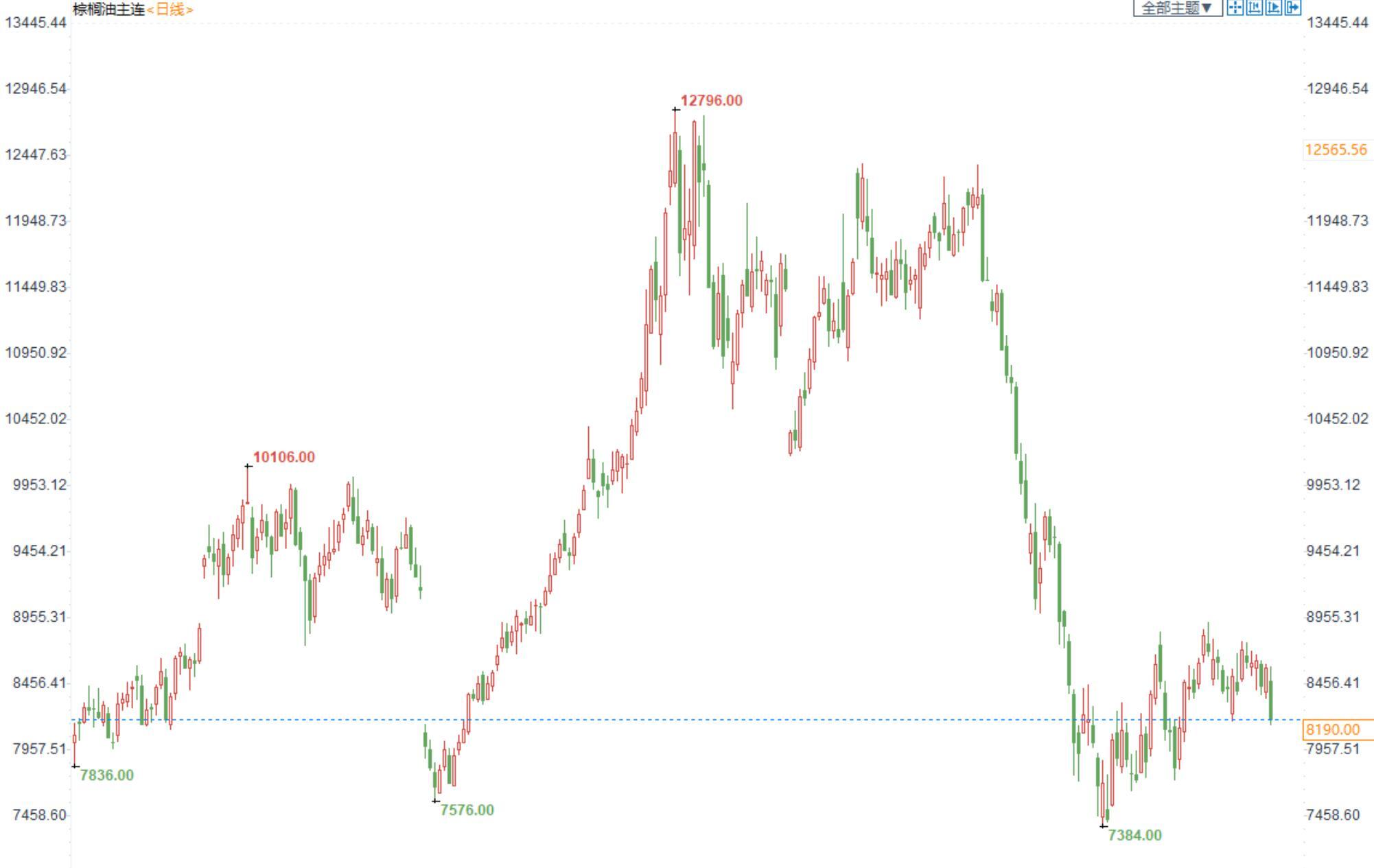 棕榈油2301合约日内跌4.63%,收盘8190元/吨;广州市场棕榈油9100元/吨。