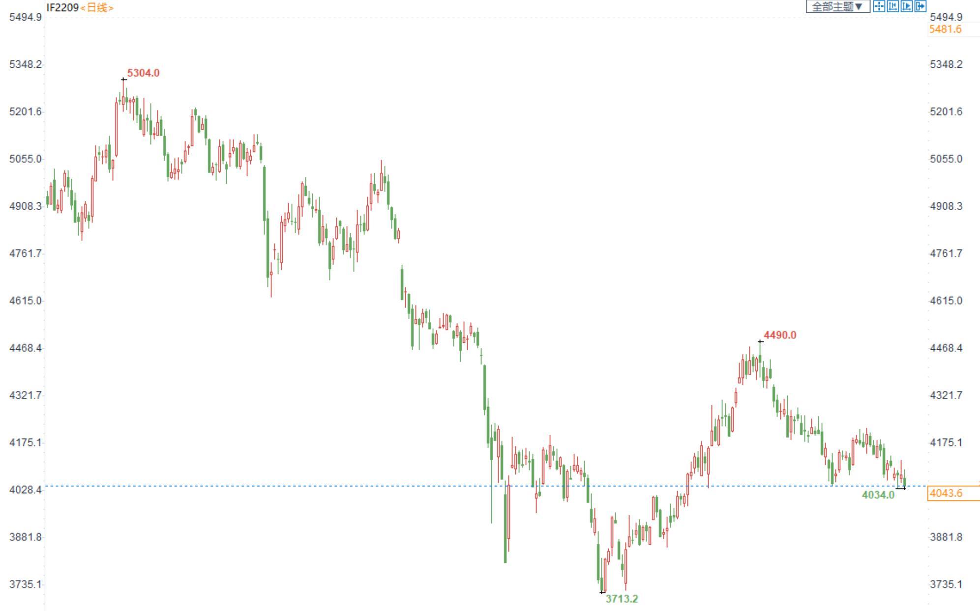 【今日行情】四大期指全线收跌。IH2209收盘价为2736.8,收跌0.98%;IF2209收盘价为4043.6,收跌0.95%;IC2209收盘价为6115,收跌0.46%;IM2209收盘价为6682.6,收跌0.72%。今日市场早盘震荡为主,午后加速走弱,上证综指跌穿3200点。风格方面,以IH为代表的大盘略强于以IC和IM为代表的中小盘,中证1000指数创7月13日以来的新低。板块方面,房地产板块延续强势,而新能源和电子板块延续8月24日以来的回调走势,也使得市场大小盘风格发生切换。两市近3000只个股收跌,总成交额较昨日大幅减少2000多亿元至7950亿元,缩量回调一定程度上标明当前市场深跌风险有限。